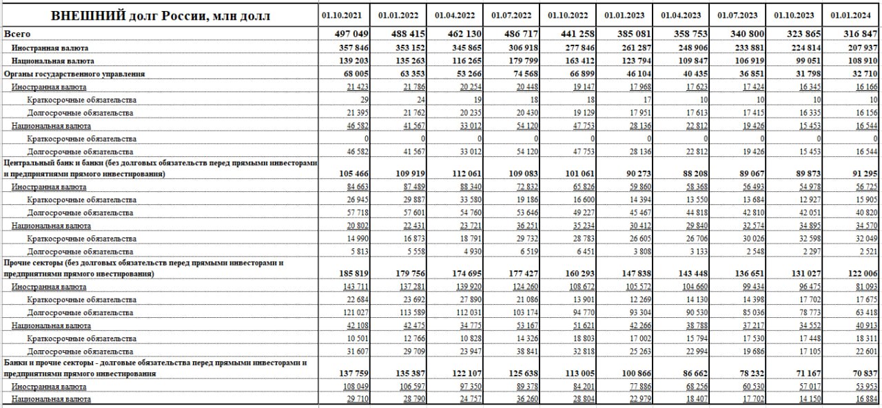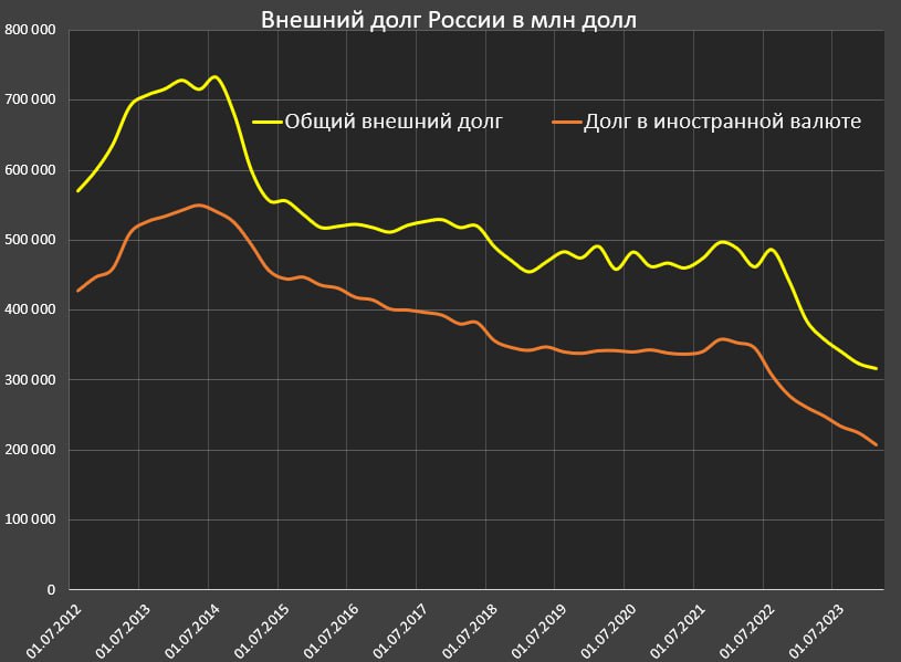 В начале 2022 внешний долг составлял 488 млрд при максимальном объеме за все время в 733 млрд (2кв14 до введения крымских санкций), а спустя два года – 317 млрд.