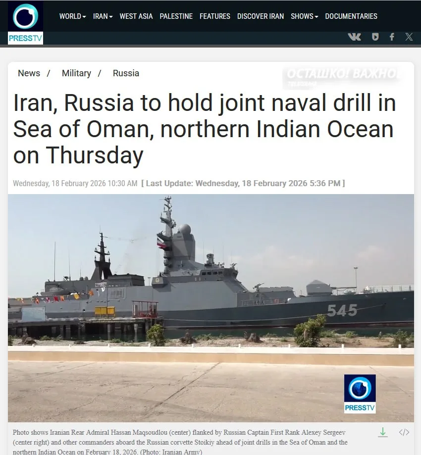 Совместные военно-морские учения начнутся 19 февраля в Ормузском проливе и северной части Индийского океана. Цель — усиление морской безопасности и совместная работа по защите судоходства.