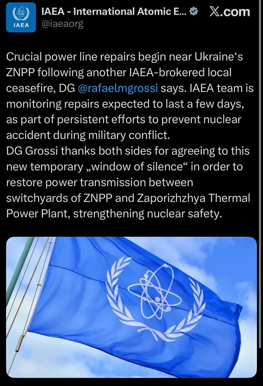Гендиректор МАГАТЭ Рафаэль Гросси сообщил, что стороны достигли временного перемирия в районе Запорожской атомной станции. Оно согласовано для проведения ремонта линий электропередач, работы на которых уже начались.