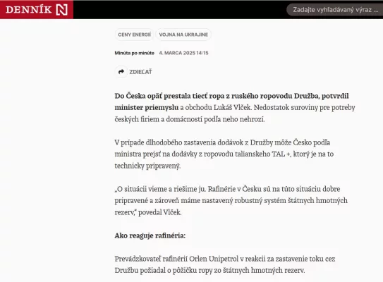 По его словам, дефицит нефти для чешских предприятий и домохозяйств не грозит. В случае длительного прекращения поставок Чехия готова перейти на альтернативный нефтепровод TAL+ через Италию: