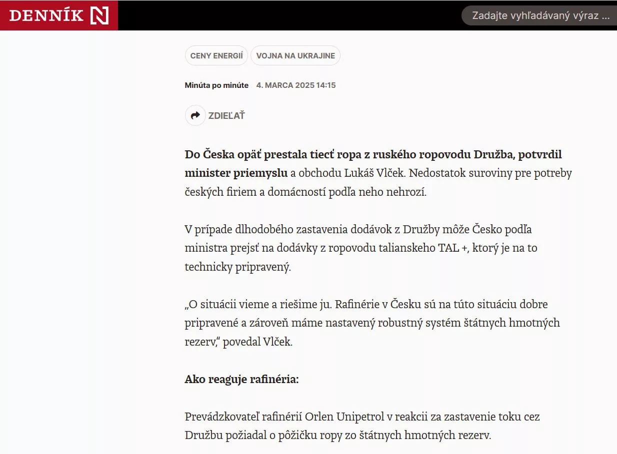 Министр промышленности и торговли Чехии Лукаш Влчек подтвердил, что поставки нефти по российскому трубопроводу «Дружба» в страну снова остановлены.