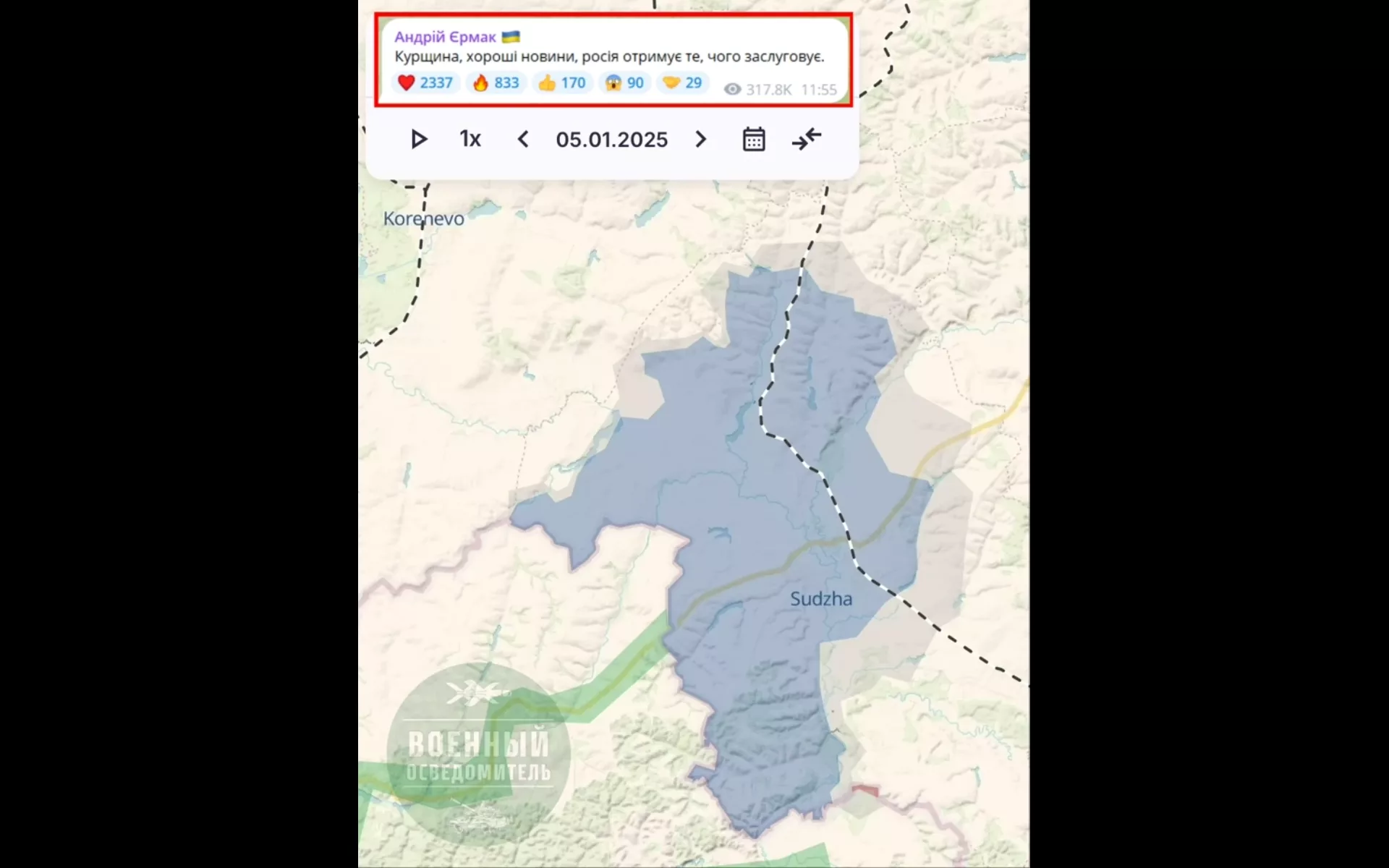 С момента начала наступления ВСУ на хутор Бердин 5 января, ВС РФ освободили уже около 60 квадратных км, выбив противника из нескольких населенных пунктов и подойдя вплотную к Судже с юго-запада.