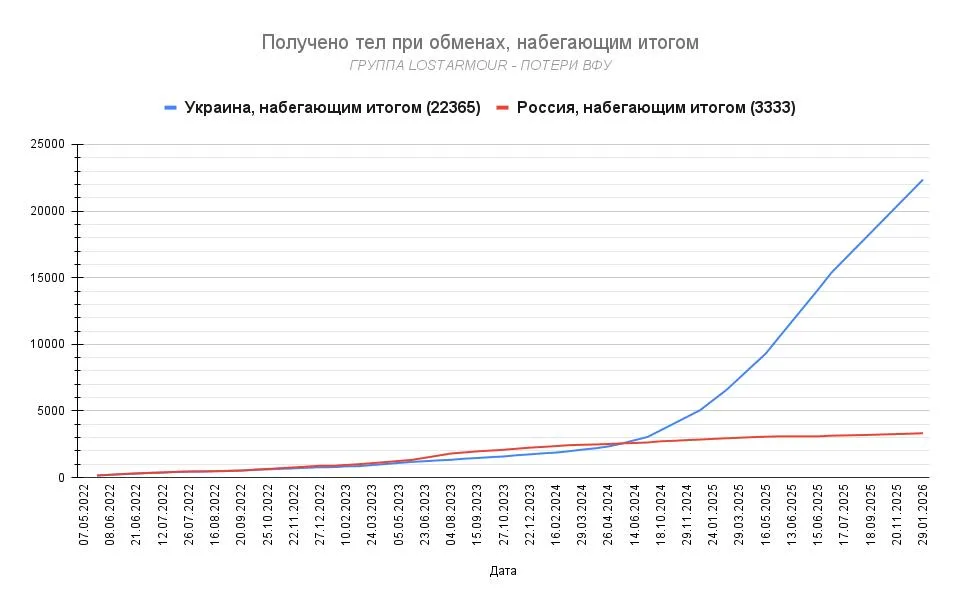 Сегодня произошел первый в этом году обмен тел погибших военных. Украине было передано 1000 тел, России вернули 38. За всё время обменов суммарно было переданно Украине 22365 тел, а России — 3333