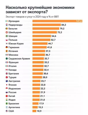 Самой независимой страной стали США — их экспорт составляет лишь 10,9% ВВП, а самой зависимой — Ирландия, где экспорт превышает 147% ВВП.