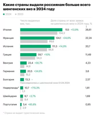 Шенгенские визы стали получать чаще. Больше всего виз выдали Италия и Франция, а также Испания — именно эти страны сейчас самые «лояльные» к российским туристам.