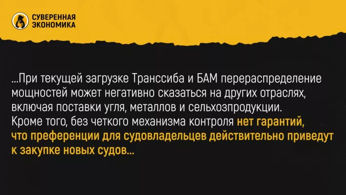 При текущей загрузке Транссиба и БАМ перераспределение мощностей может негативно сказаться на других отраслях, включая поставки угля, металлов и сельхозпродукции. Кроме того, без четкого механизма контроля нет гарантий, что преференции для судовладельцев действительно приведут к закупке новых судов, а не просто перераспределят доходы в пользу отдельных игроков. Вопрос также связан с более широкой стратегией импортозамещения в логистике. Государство уже предпринимает шаги для поддержки российского судостроения, однако его модернизация требует значительных инвестиций и долгосрочного планирования. Доступ к железнодорожным мощностям может быть полезным инструментом, но при условии, что он не создаст перекосов в транспортной системе.