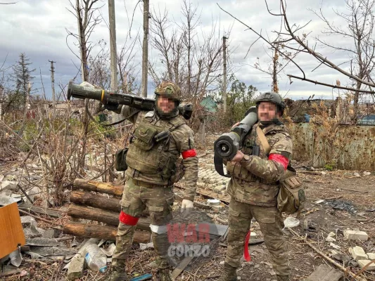 Разведчики 150-й дивизии на бывших позициях ВСУ в Максимильяновке (восточнее Курахово) с трофейными гранатомётами AT-4 и «Матадор».