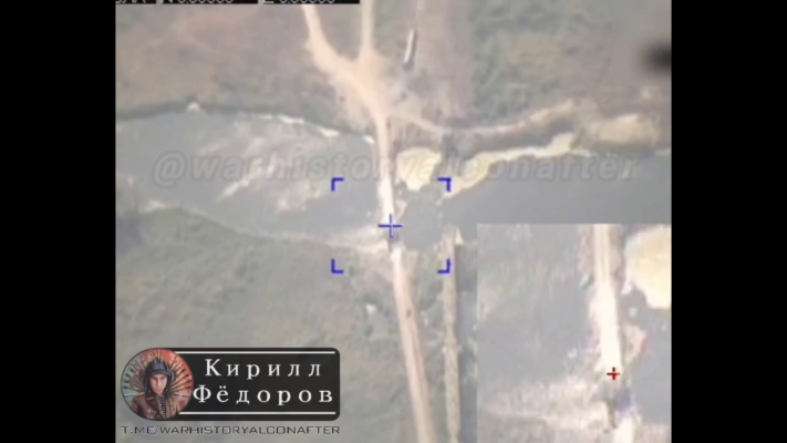 Фронтовой бомбардировщик Су-34 при помощи ракеты Х-38 добивает переправу через реку Оскол у города Купянск-Узловой.