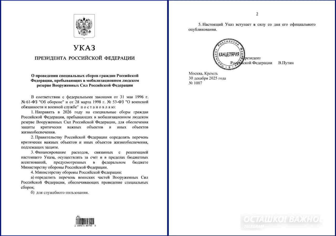 «Направить в 2026 году на специальные сборы граждан Российской Федерации, пребывающих в мобилизационном людском резерве Вооружённых сил Российской Федерации, для обеспечения защиты критически важных объектов и иных объектов жизнеобеспечения», — говорится в документе.