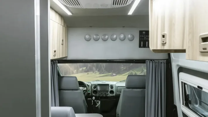 Жилой модуль рассчитан на четверых. Поворотные кресла водителя и пассажира легко трансформируются в часть обеденной зоны. Спальные места выполнены в двухъярусной компоновке: две кровати размером 140 на 180 дюймов трансформируются по мере необходимости. Под ними — внутренние багажные отсеки для всего необходимого в дороге.