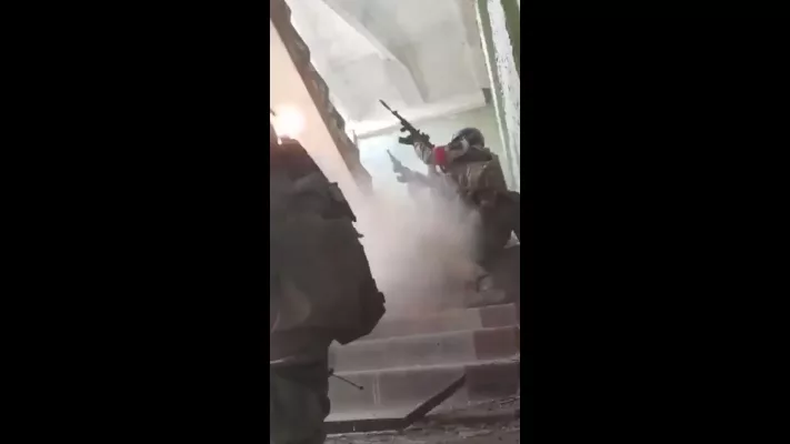 На кадрах — штурм здания. Рядом с военными падает граната, сброшенная боевиком с верхнего этажа. Боец отбрасывает её ногой, после чего она детонирует, не причинив бойцам ущерба.