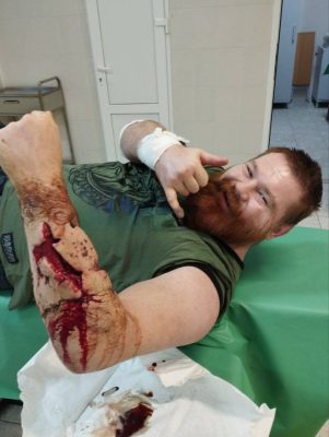 На кадрах Дацик лежит в больнице с рваной раной руки.