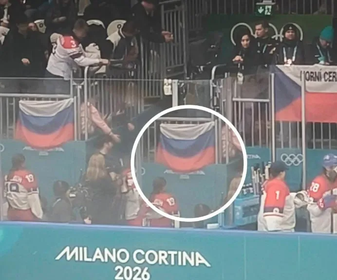 Инцидент произошел во время матча между женскими сборными США и Чехии. Кто именно вывесил триколор, неизвестно.