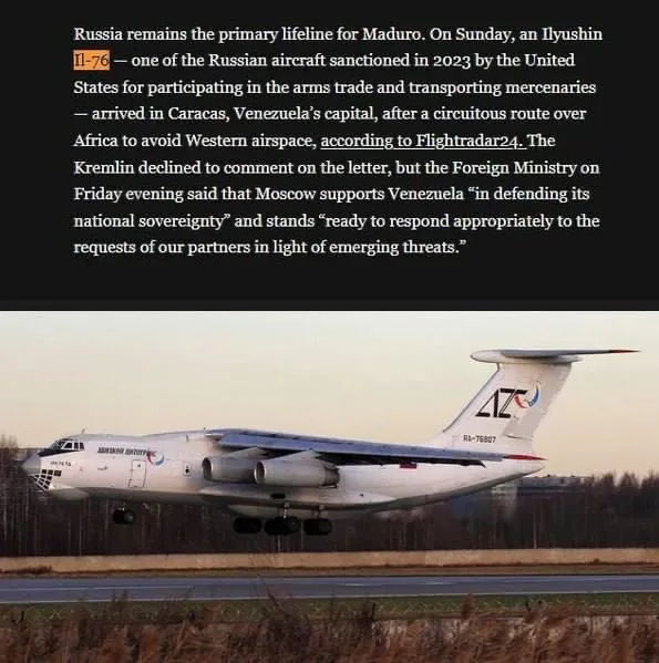 Украинские и американские СМИ сообщают, что в Венесуэле приземлился российский военный самолет Ил-76, связанный с компанией Aviacon Zitotrans, которая находится под санкциями за военные перевозки.