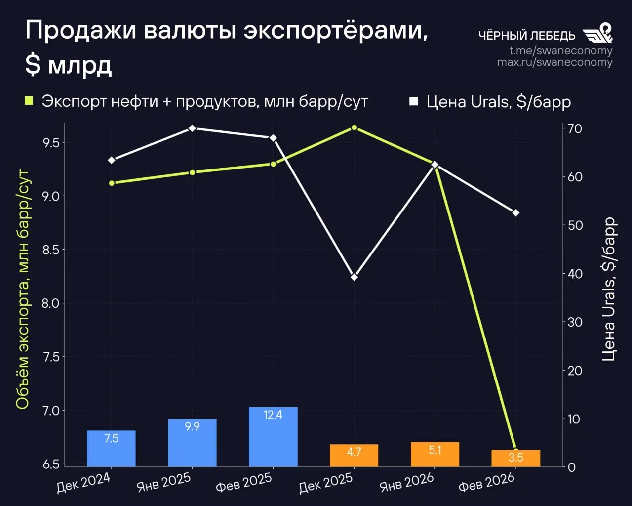 Безусловно, еще на этом фоне продажи валютной выручки экспортерами рухнули очень прилично, см. наш график. В итоге, создан дефицит валюты, из-за чего курс рубля летит в бездну.