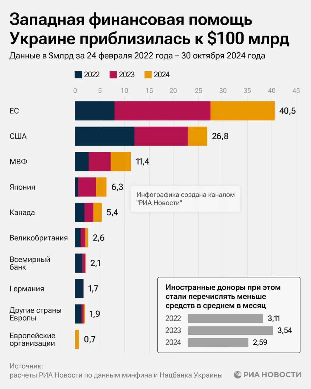 Западные страны и организации с февраля 2022 года профинансировали украинский бюджет почти на $100 млрд, но в этом году отчисления на минимуме — в среднем $2,59 млрд в месяц, следует из расчетов РИА Новости.