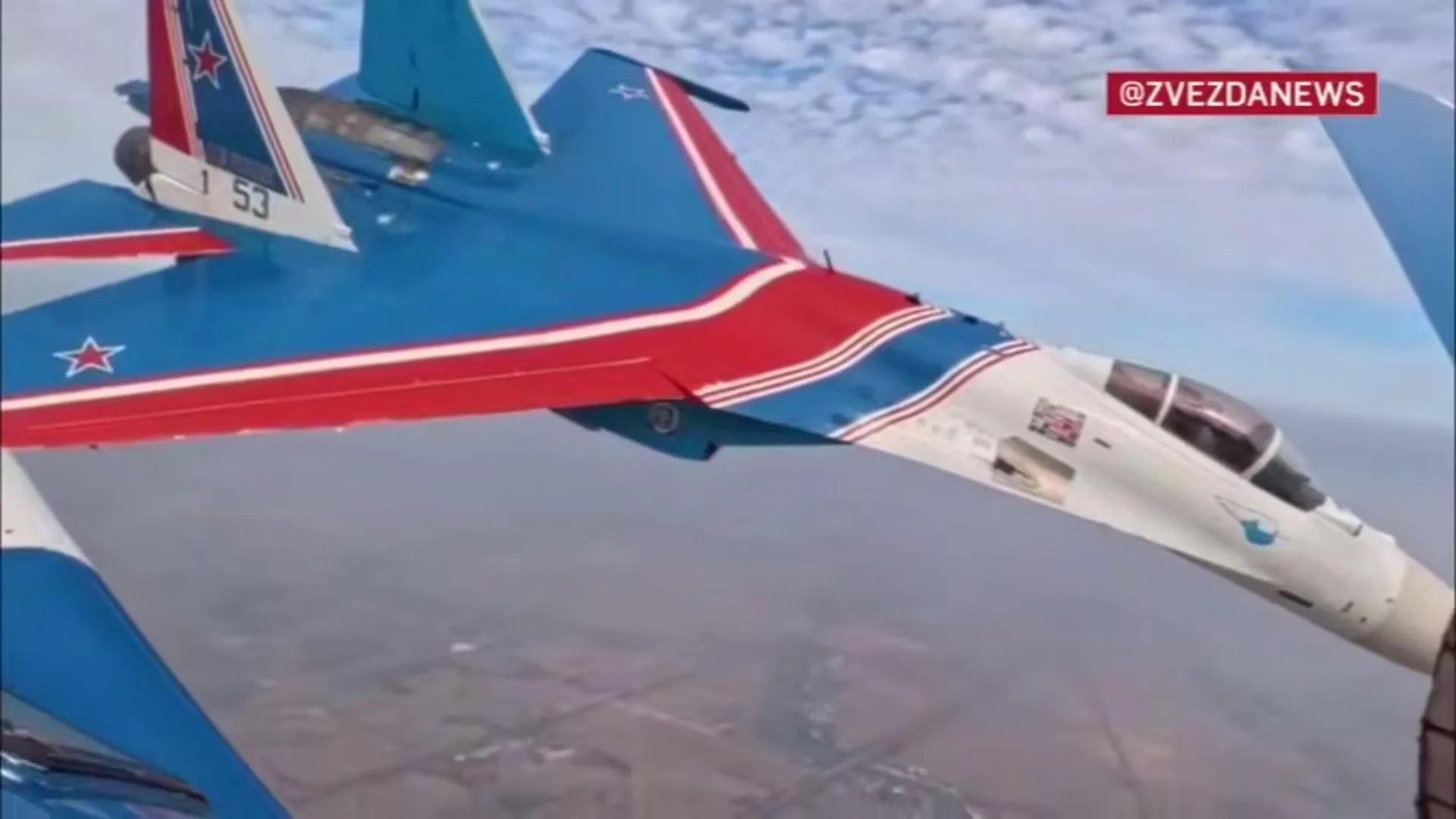 Су-35С и Су-30СМ исполнили «петлю Нестерова», «бочку», «вираж». Более того, летчики показали наиболее зрелищные элементы, например, фигуры «зеркало», «колокол», роспуск.