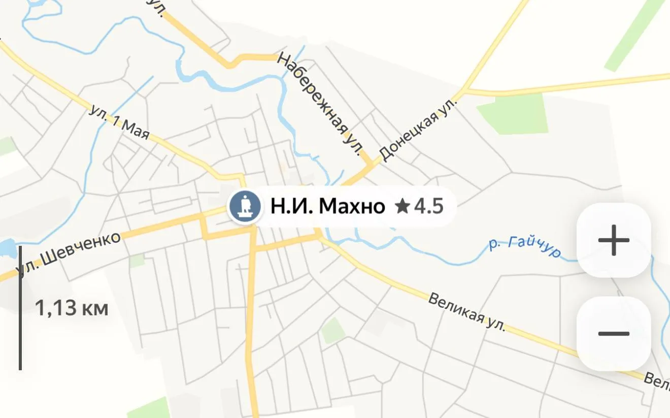 Боец 57 бригады срывает жовто-блакитный прапор с памятника Нестора Махно и укрывает его своим флагом. Памятник стоит рядом с Домом культуры по адресу улица Шевченко, 29. Это в двух улицах к западу от Соборной, на которой украинские захистники побросали оргтехнику штаба и секретную документацию.