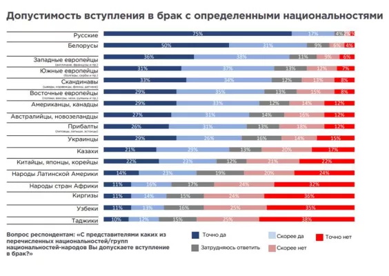 Согласно опросу АНО «Центр развития гуманитарных технологий «Новая эра», проведенного среди россиян в возрасте от 18 до 35 лет, самыми предпочитаемыми партнерами для россиян были бы русские (92%), менее желанными- таджики (22%)