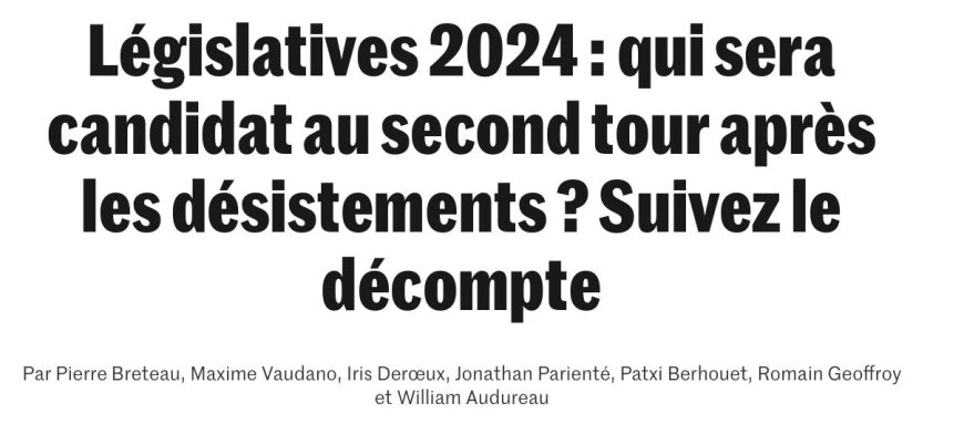По итогам первого дня голосования в более чем 300 избирательных округах кандидаты от трех основных блоков правых, левых и макронистов прошли во второй тур. По задумке Макрона, кандидаты от его коалиции и от блока левых, оказавшиеся на третьем месте в своем округе по итогам первого тура, должны отказаться от участия во втором туре, чтобы блокировать правых. Голоса их избирателей должны перейти к кандидату, получившему второе место.