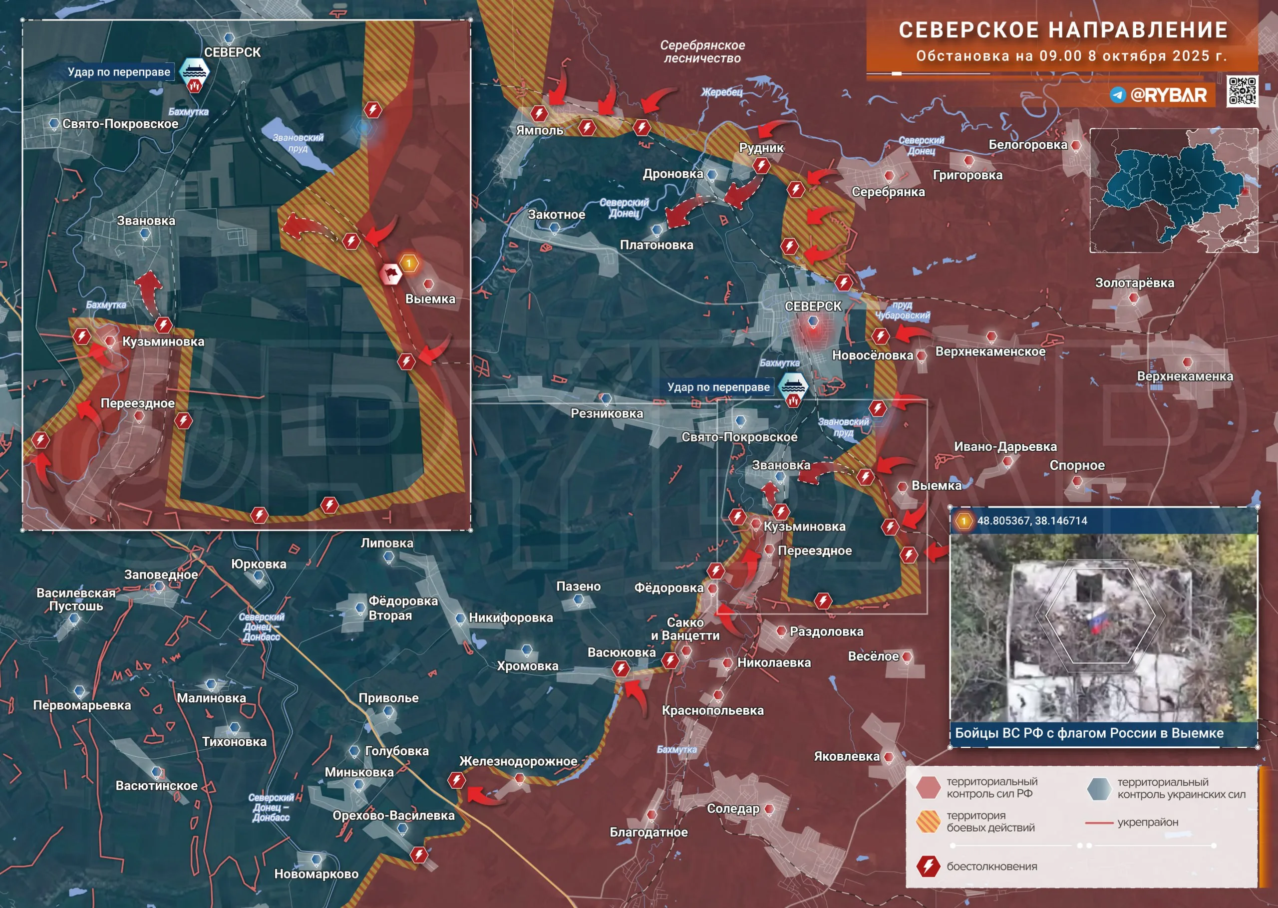 Российские войска развивают наступление на южных подступах к Северску. Освободив Выемку и Федоровку, ВС РФ приближаются к Звановке через Кузьминовку.