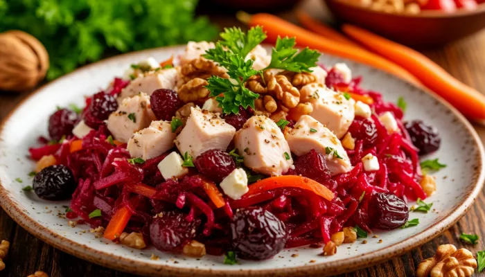 Этот салат — настоящая находка для тех, кто ищет альтернативу тяжелым блюдам. Он не только освежает в жару, но и радует оригинальным вкусом. Сочетание сладкого чернослива, нежной курицы и пикантного чеснока создает неповторимый вкусовой букет, который покорит даже самых искушенных гурманов!