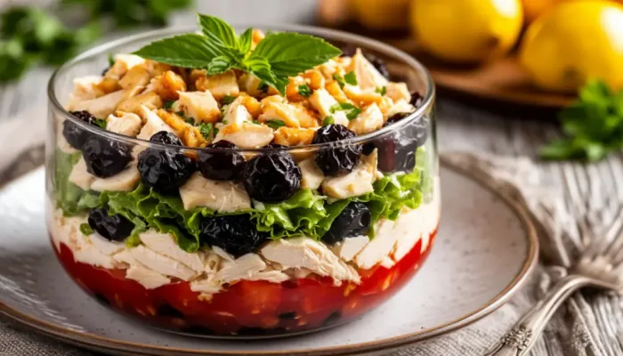 Превосходное блюдо для особых случаев — оно сохраняет форму в течение нескольких часов и радует глаз четкими линиями. Комбинация нежного куриного филе, сливочного сыра, сладости чернослива и хрустящих орехов создает сложную палитру вкусов, которая не оставит гостей равнодушными