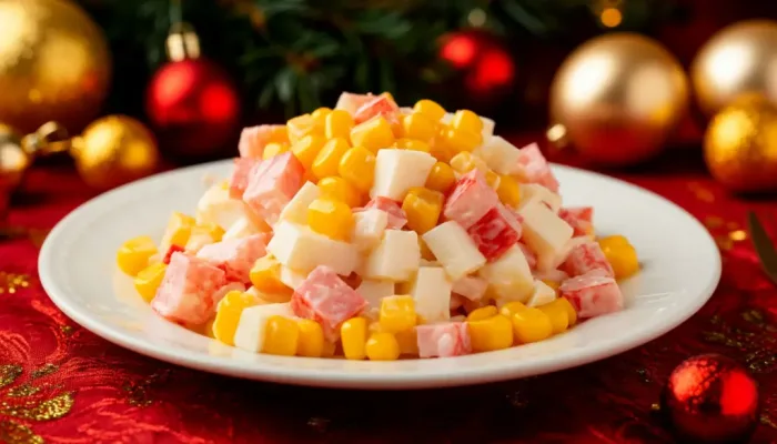 Украсьте салат, щедро посыпав сверху яркие зёрна кукурузы. Они добавят свежести, сладковатый оттенок и праздничный вид.