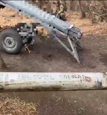 Самодельная пусковая установка, спроектированная российскими бойцами, состоящая из четырех направляющих 122-мм реактивных снарядов РСЗО «Град», установленная, судя по всему, на двухколесный ход от 120-мм миномета 2С12 «Сани».