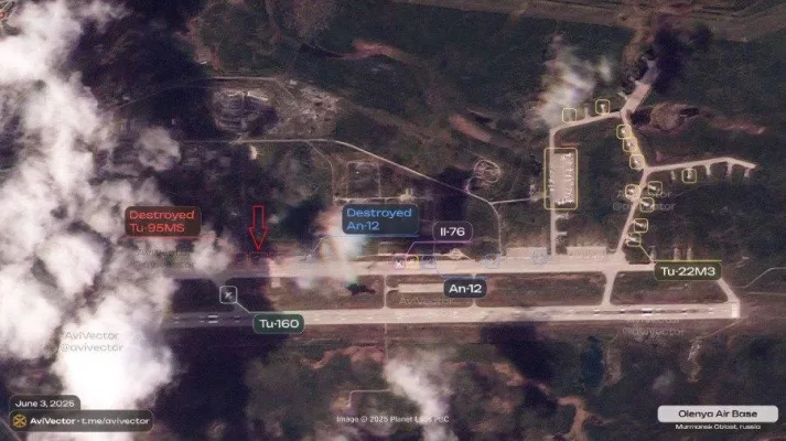 Атаки украинских FPV-дронов пришлись на аэродромы в Мурманской, Иркутской, Ивановской, Рязанской и Амурской областях. В Ивановской, Рязанской и Амурской – атаки отбиты. В Мурманской и Иркутской – несколько самолетов загорелись, но пожары быстро ликвидировали. На фото – авиабаза в Оленегорске.