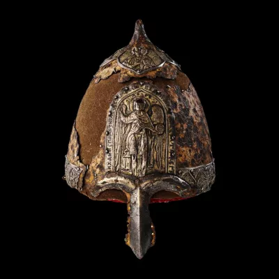 Он был найден в 1808 году во Владимирской губернии двумя девками, собиравшими орехи. Шлем изготовлен из цельного куска металла знатного качества и богато украшен орнаментом с элементами серебра 900-й пробы, что указывает на его принадлежность элите.