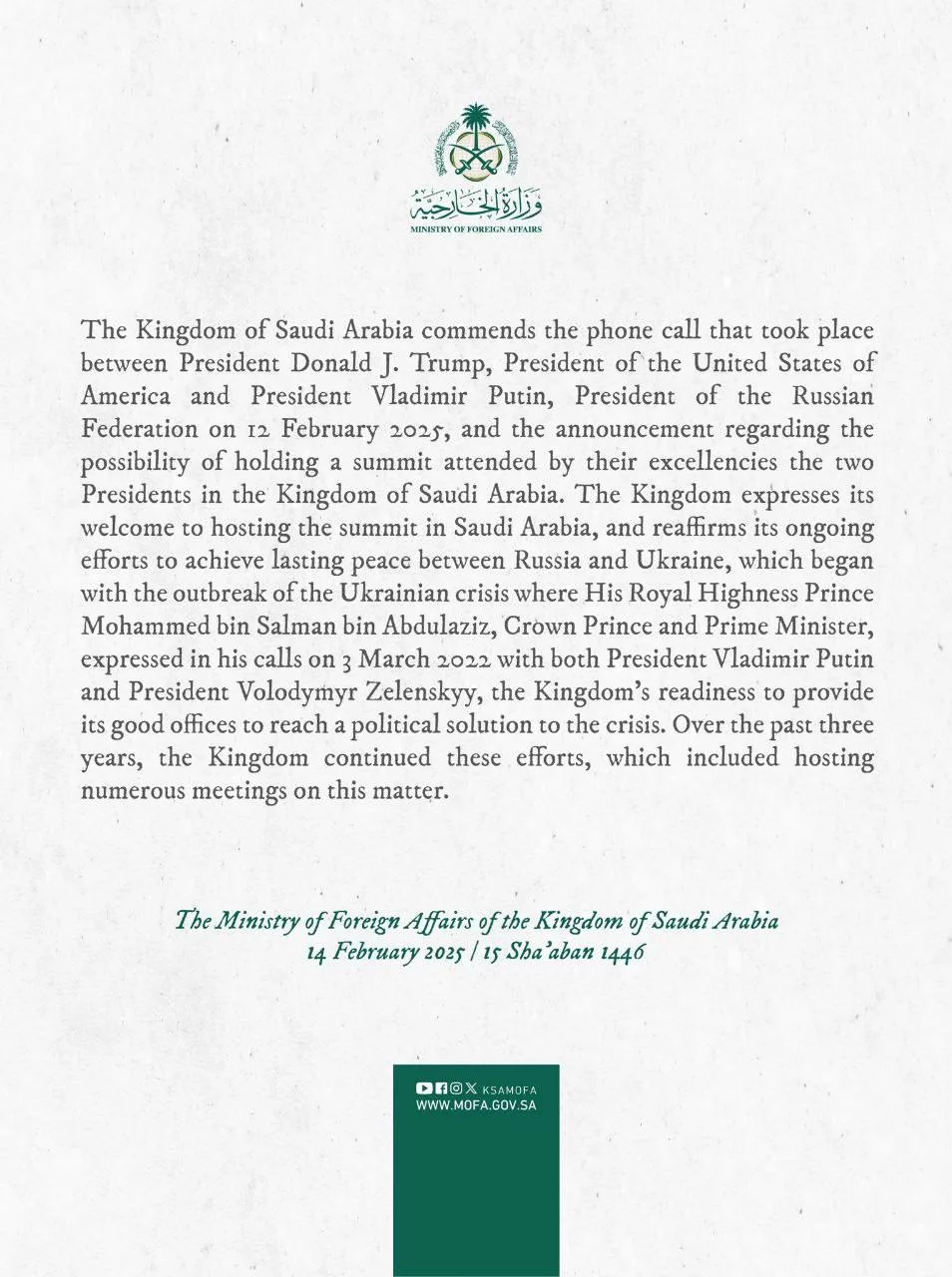 «Королевство выражает свое согласие на проведение саммита в Саудовской Аравии и подтверждает свои постоянные усилия по достижению прочного мира между Россией и Украиной», — говорится в заявлении министерства иностранных дел Саудовской Аравии.