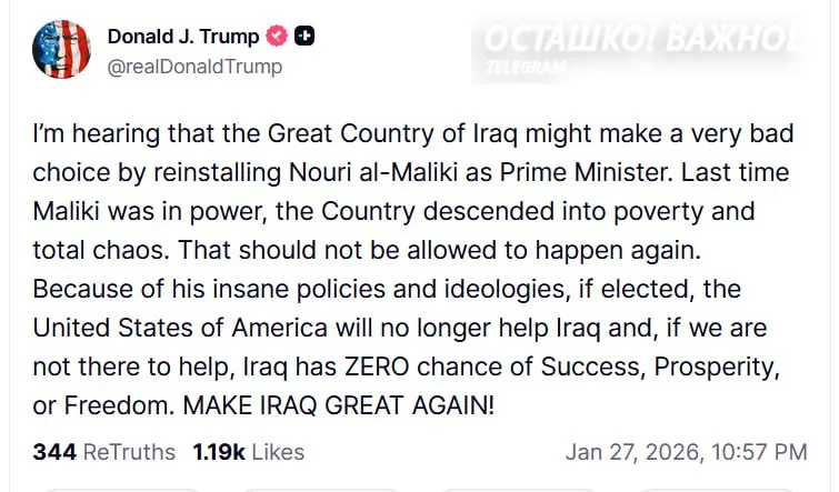 «Из-за его безумной политики и идеологий, если его изберут, США больше не будут помогать Ираку, и если мы не будем помогать, у Ирака не будет никаких шансов на успех, процветание или свободу. Сделаем Ирак снова великим!»