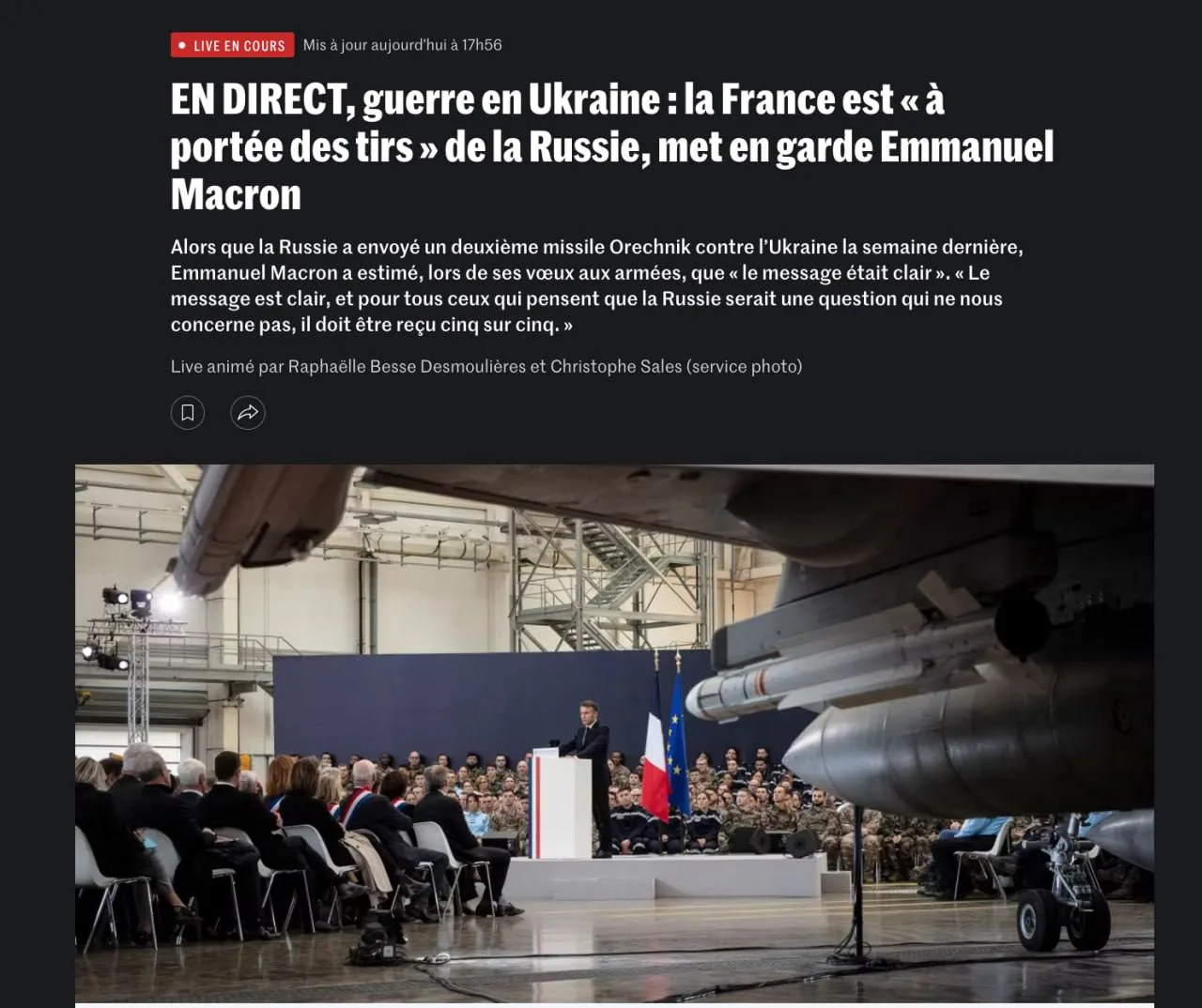 «Если год назад Украина в подавляющем большинстве зависела от американских разведывательных возможностей, то сегодня две трети из них обеспечивает Франция», — цитирует президента Франции Le Monde.