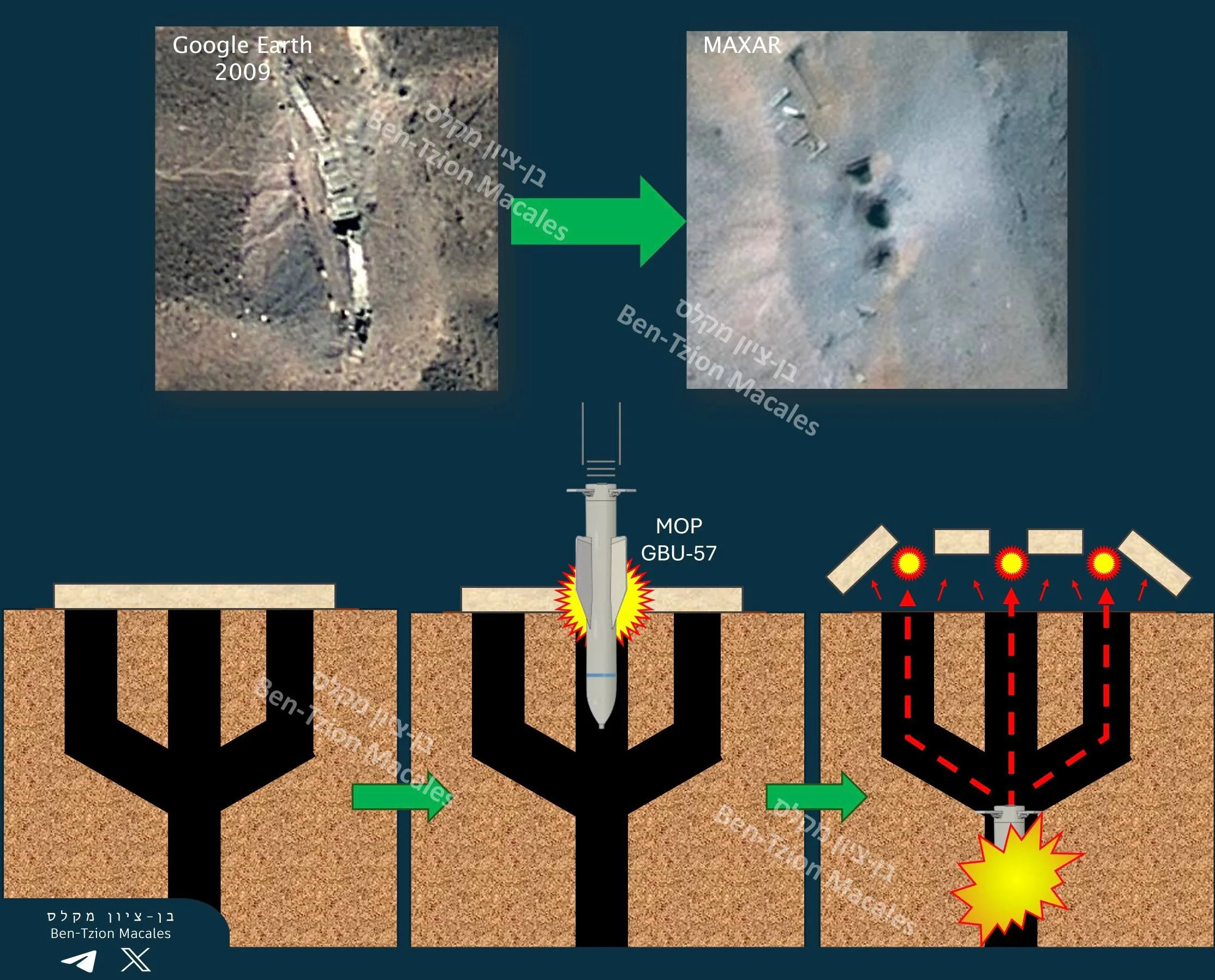 - На спутниковых снимках объекта в Фордо места попадания бомб GBU-57A/B MOP имеют по три отверстия каждый, что изначально было принято за близкое попадание трёх бомб в одно место, однако удар в каждом месте на самом деле был одинарным и направленным в глубь канала основной вентиляционной шахты.