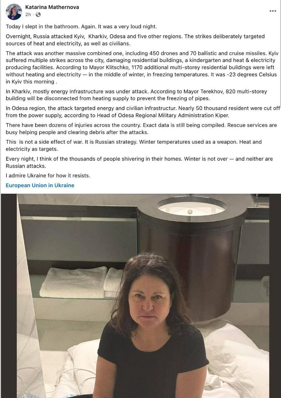 «Удары были намеренно направлены на источники тепла и электроэнергии, а также на гражданское население… Это не побочный эффект войны. Это российская стратегия. Зимние температуры используются как оружие. Тепло и электроэнергия — как цели», — написала Катарина Матерова.