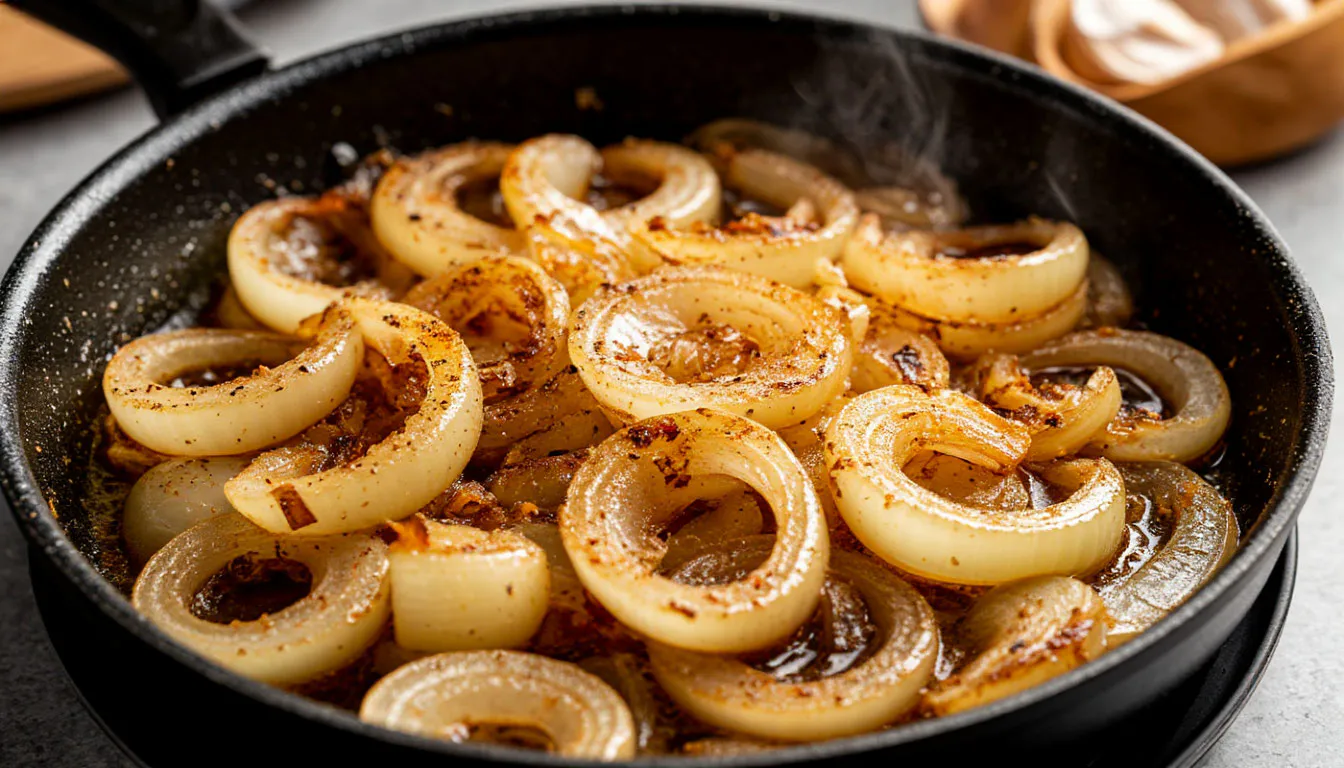 Когда лук попадает на сковороду, требуется время, чтобы разрушились клеточные стенки и началась карамелизация. Сода, обладая щелочной средой, ускоряет этот процесс, помогая высвобождению природных сахаров лука. Эти сахара вступают в реакцию Майяра, которая придаёт мясу румянцевый оттенок, и лук быстро приобретает карамельный цвет и сложный аромат.