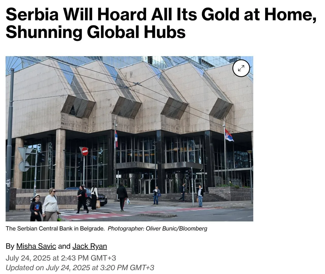 До недавнего времени часть золота Сербии хранилась в хранилищах Швейцарии (Берн) и Великобритании (Лондон), однако весной и летом 2025 года все госзапасы были перевезены на родину буквально за два месяца. Последнюю партию в 5 тонн планируют перевезти из Швейцарии в ближайшее время.