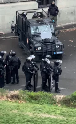 На фото видно отряд полиции у здания парламента рядом с машиной с неким устройством на капоте.
