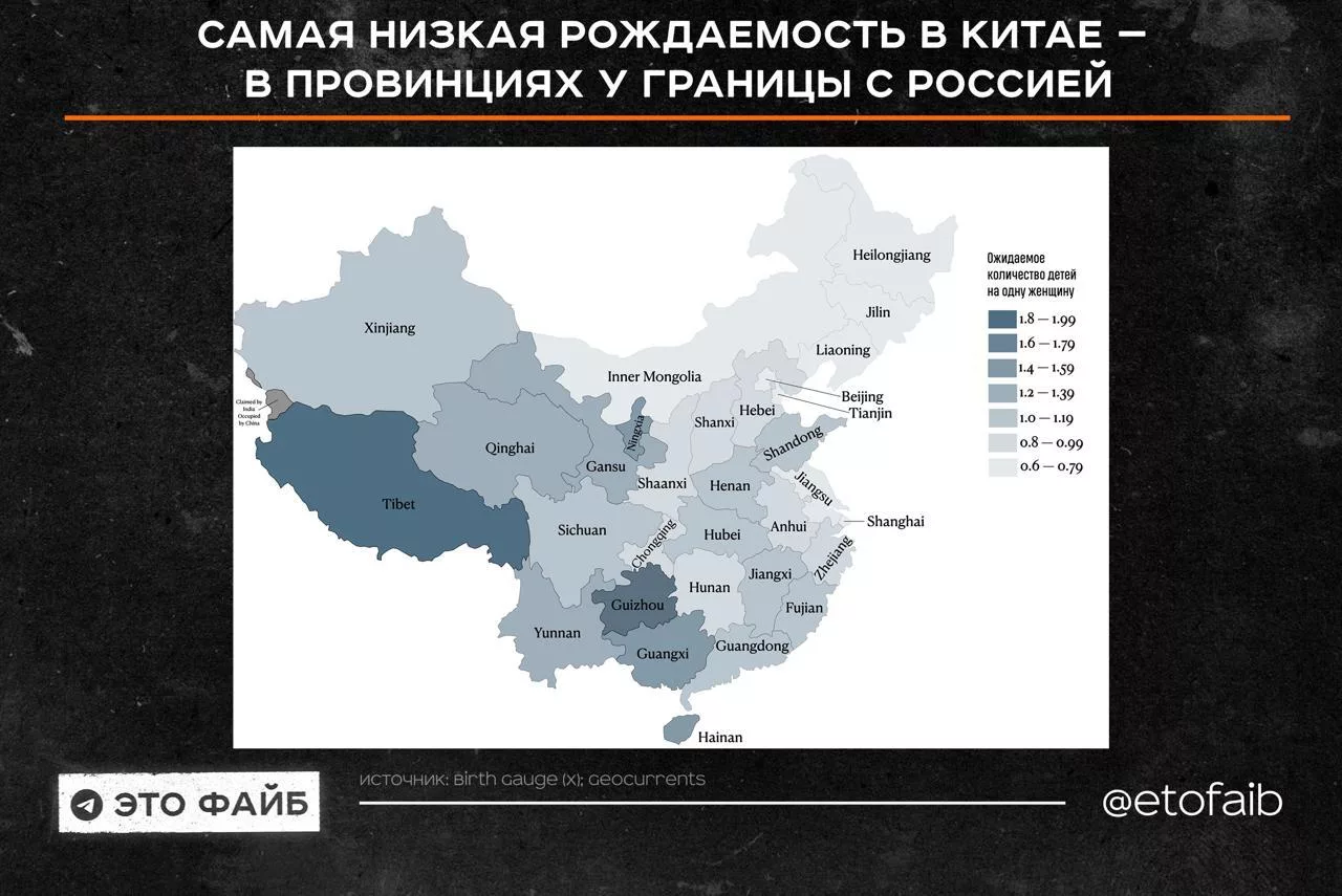 Все китайские провинции находятся ниже уровня воспроизводства населения, и даже самая высокая рождаемость в Тибете – лишь 1,97 (нужен коэффициент как минимум 2,1).