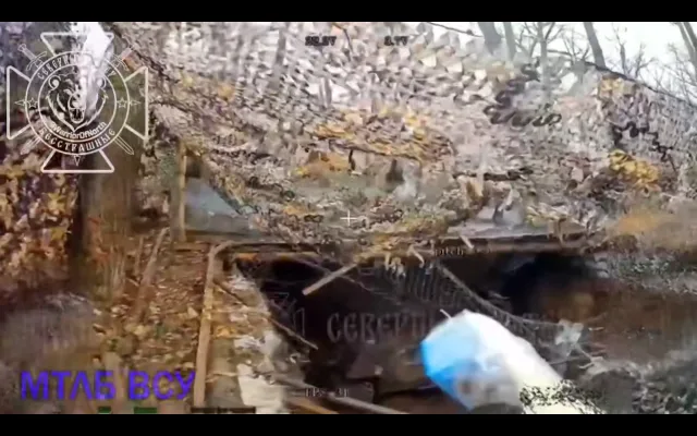В Харьковской области на Волчанском направлении расчеты 18 мсд 11 АК группировки Север» обнаружили в лесном массиве позицию ВСУ с замаскированной МТЛБ. Ударом FPV вражеская боевая машина уничтожена.
