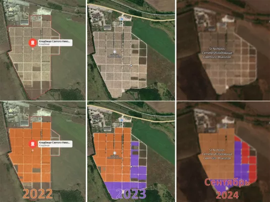 Динамику изменения площади захоронений прекрасно видно на первом изображении.