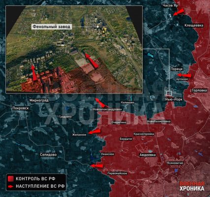 После активного продвижения на юго-западе посёлка ВС РФ постепенно расширяют контроль над восточной частью в районе Советской улицы за рекой Кривой Торец. Основной рубеж обороны ВСУ в районе Нью-Йорка постепенно смещается к фенольному заводу. Туда подразделения украинской армии пока оттягиваются исключительно на перегруппировку и пополнение боекомплекта, однако удерживать текущие позиции в районе грузовых терминалов «Новой почты» всё сложнее. Там же, в районе фенольного завода, ВСУ пока ещё удерживается и железнодорожная станция, заняв которую ВС РФ получат возможность продолжить наступление в сторону Торецка. В целом можно констатировать, что российские войска стараются использовать все преимущества рельефа при любой наступательной операции и штурм Нью-Йорка в этом отношении не является исключением из правил — движение «снизу вверх» практикуется только в том случае, если других вариантов нет. Основной вектор атаки при этом идёт с юго-запада, вдоль ключевой высоты 222 со стороны Петровской горы.