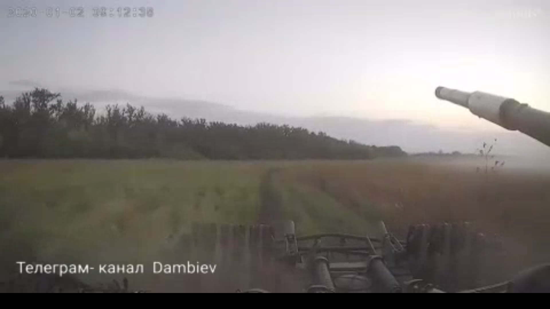 Экипаж танка разминирует минным тралом подходы к этому населенному пункту для дальнейшего успешного наступления наших войск.
