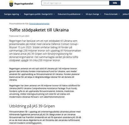 Шведское правительство решило, что ВСУ реализуют решение о поставках систем военной техники на Украину. В рамках решения по снабжению шведские ВС могут иметь до 60 человек на местах в Польше, Румынии и Словакии.