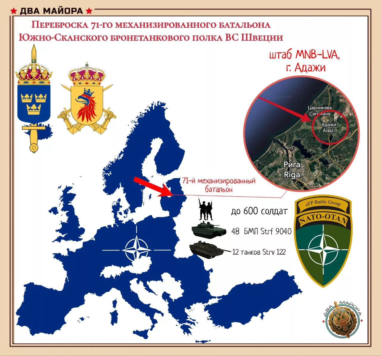 Предислоцирован личный состав (до 600 в/сл) и техника (48 БМП Strf 9040 и 12 танков Strv 122) 71-го механизированного батальона Южно-Сканского бронетанкового полка ВС Швеции. Контингент будет действовать в составе Многонациональной бригады НАТО в Латвии (MNB-LVA, штаб в г. Адажи) совместно с боевой группой передового присутствия (EFP-Battlegroup Lithuania).
