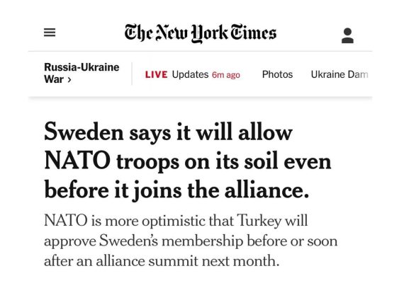 📝 «НАТО смотрит с оптимизмом на то, что Турция одобрит членство Швеции до или вскоре после саммита альянса в следующем месяце», – говорится в статье.