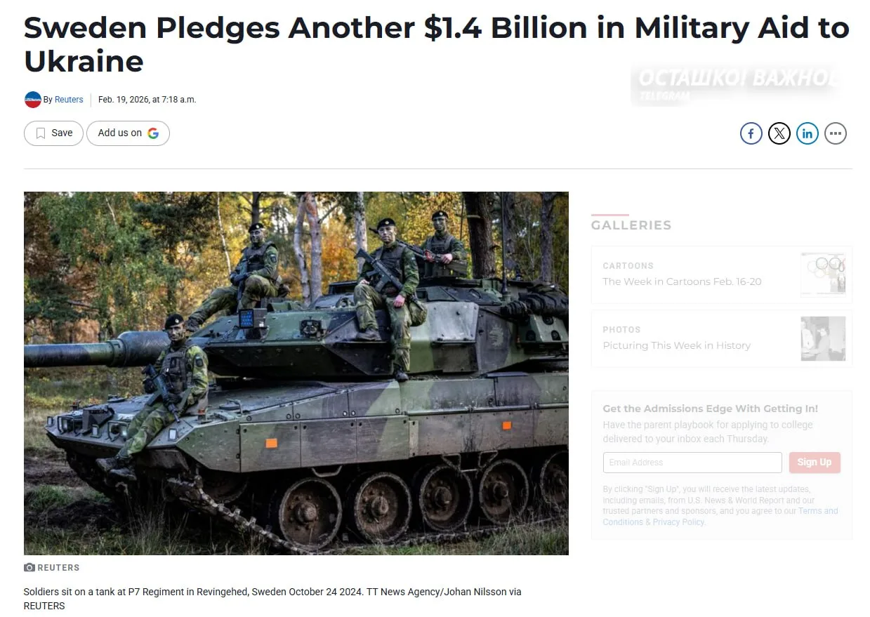 С учётом этого пакета военная поддержка Швеции с начала вторжения России в 2022 году достигла 103 млрд крон (₽880,65 млрд). Кроме того, Швеция планирует поручительство перед Всемирным банком по кредиту Украине на 2,5 млрд крон.