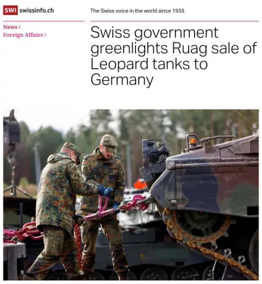 Швейцарское правительство заявило, что не возражает против продажи 71 танка Leopard 1 A5 немецкой стороне. Танки находятся на хранении в Италии. Покупателем выступает немецкая компания. Условием сделки является запрет на последующую передачу техники Украине.
