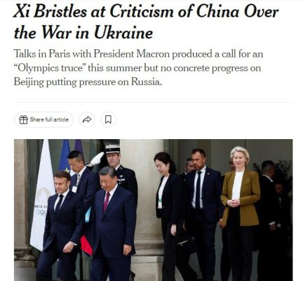 По данным издания, президент Франции попытался убедить китайского лидера повлиять на РФ для скорейшего окончания СВО на Украине. В ответ Си Цзиньпин выступил против того, чтобы этот кризис использовался для «перекладывания ответственности на третьи страны и очернения их репутации».
